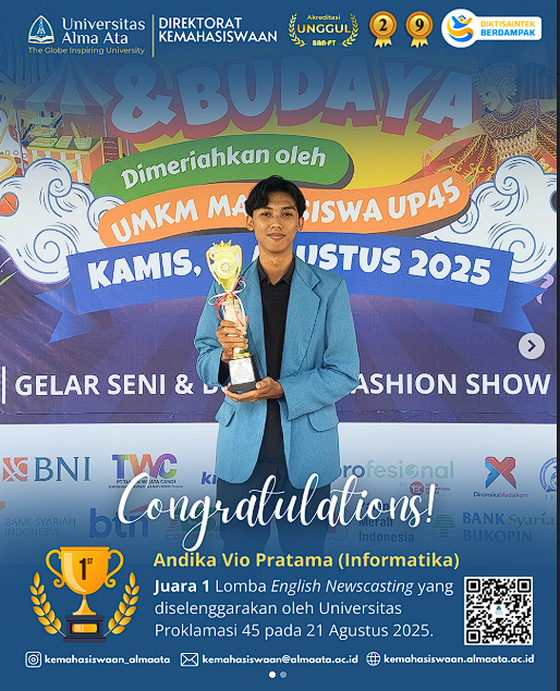 Selamat kepada Andika Vio Pratama, mahasiswa Prodi Informatika Angkatan 2024 Universitas Alma Ata, atas prestasi meraih Juara 1 Lomba English Newscasting Mahasiswa se-DIY yang menjadi bukti dedikasi dan kompetensi dalam bidang bahasa.